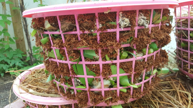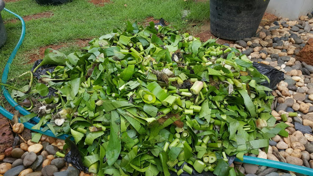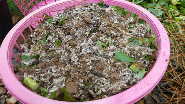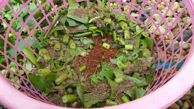 ชั้นต่อมา โรยด้วยอาหารเสริม คือผักตบที่หั่นท่อนไว้ (หรือใครที่ใช้ต้นกล้วย หยวกกล้วย ก้านกล้วย ก็เอามาใช้ได้ค่ะ)