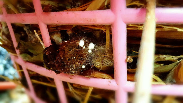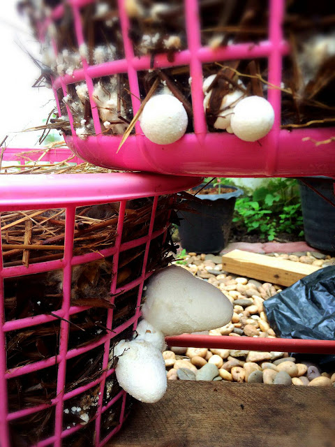 จะสังเกตุเห็นเชื้อเห็ดเริ่มเดินใยสีขาวๆ ไปทั่ววัสดุเพาะ บางจุดจะมีตุ่มเหมือนเม็ดสาคู กระจายอยู่ทั่วไป นั่นแหละค่ะ ตุ่มเห็ด