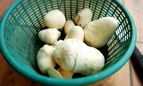 ฉีกถุงก้อนเห็ดออกมา แล้วย่อยเชื้อเห็ดให้เป็นชิ้นเล็กๆ ก้อนเห็ด 1 ก้อน โรยแป้งสัก 1-2 ช้อนโต๊ะ แล้วคลุกเคล้าให้เข้ากัน