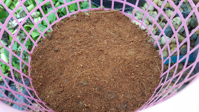 เอาขุยมะพร้าวที่ผสมไว้ รองก้นตะกร้า ให้มีความหนาสัก 1 นิ้ว แล้วกดให้แน่น แต่อย่าแน่นมาก