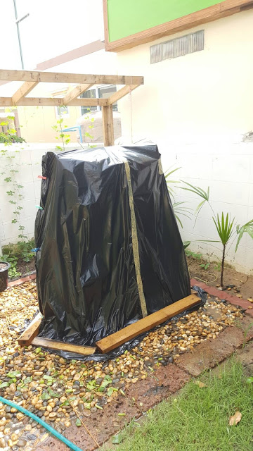 หลังจากนั้นก็เอาตะกร้าที่เพาะเห็ดฟางไว้ มาเรียงกัน แล้วคลุมด้วยพลาสติก เพื่อทำให้เกิดความร้อน เชื้อเห็ดจะได้เดิน